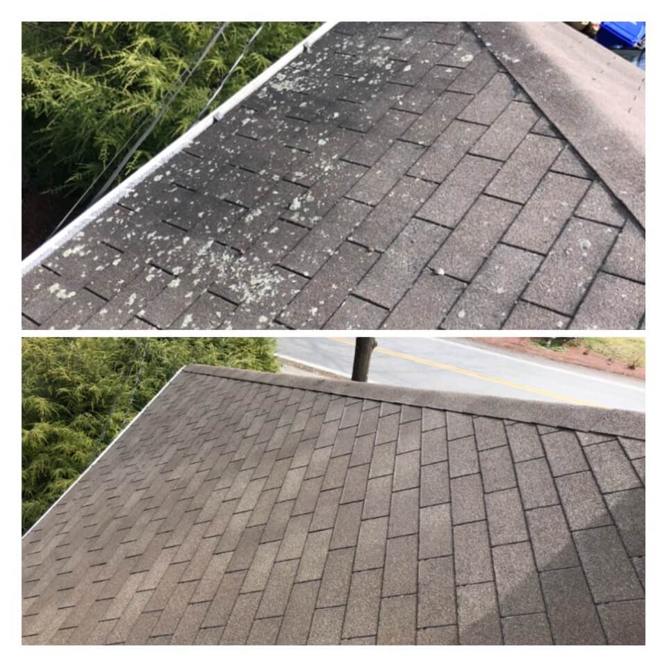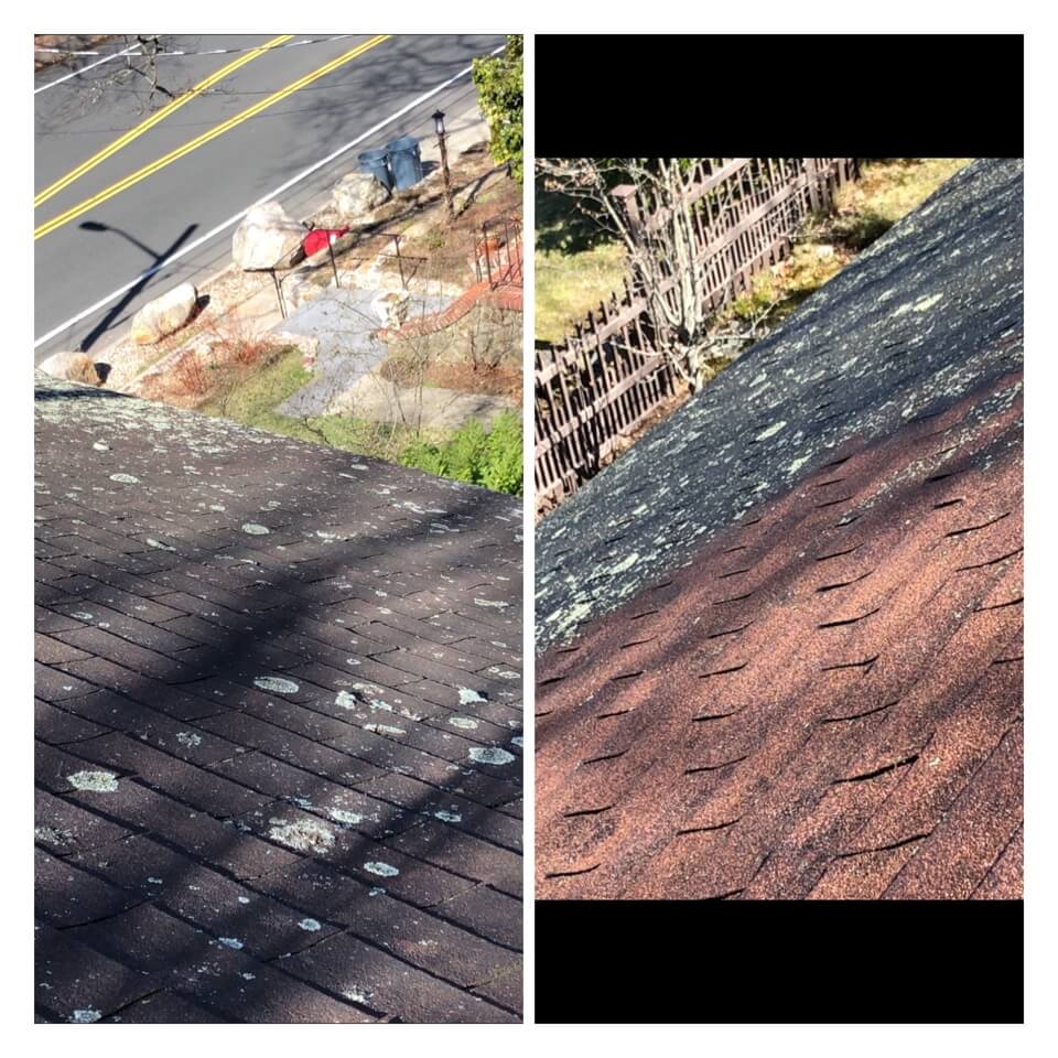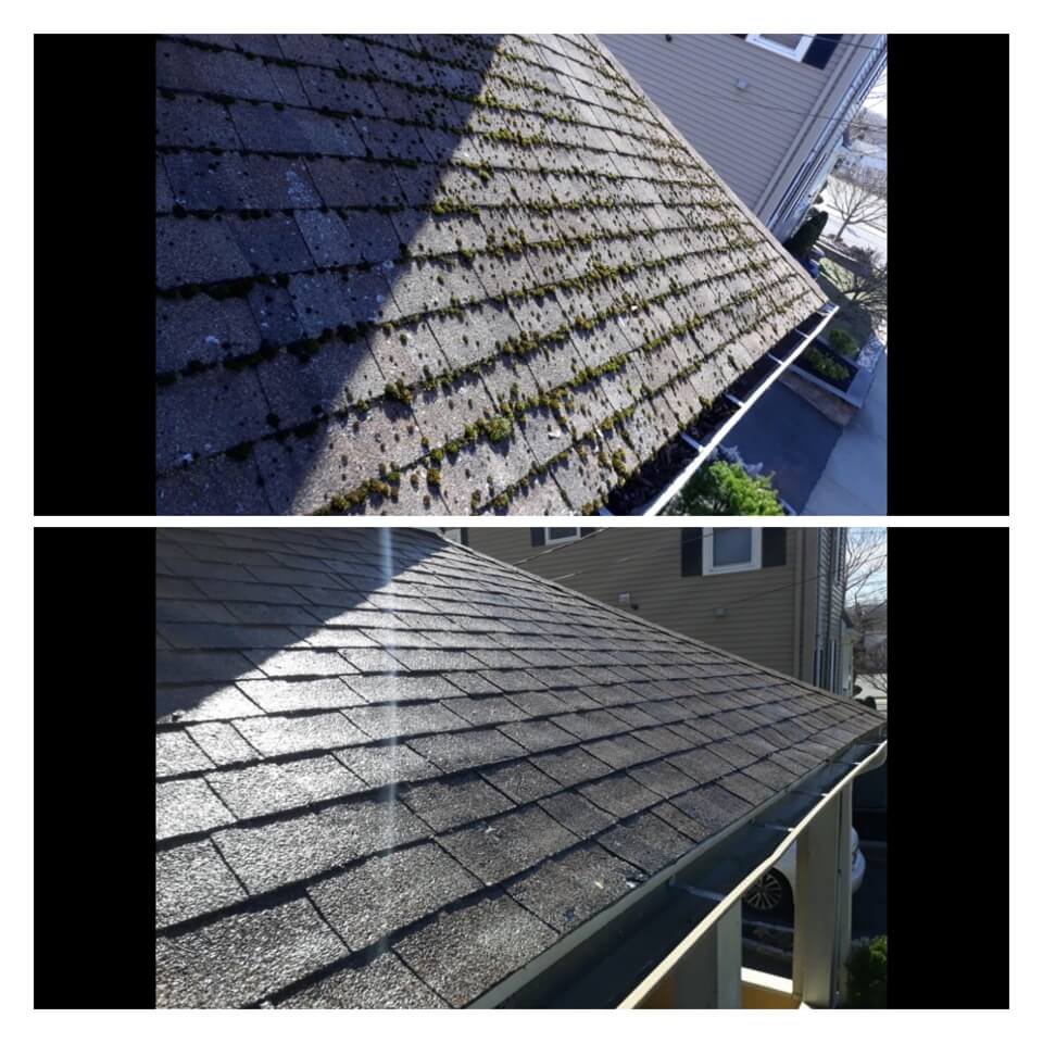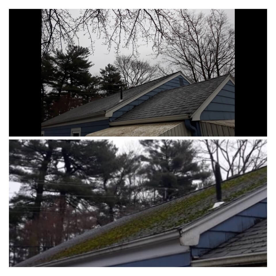 HiCleaners is the most experienced company in Sharon, MA that deals with roof washing and roof soft washing. All of our employees are trained to recognize precise solution mixing ratios to provide you with the safest and most effective soft washing service. Roofs are a commonly neglected part of a house due to the fact that most people don’t have ladders to access it, so it is very easy to just leave it alone and forget about problems that may start to arise. Just like many home owners, discoloration and small bits of moss on a roof can be overlooked because of the misconception that it is just aesthetic. However, it isn’t just aesthetic, the moss slowly lifts the granules off the shingles which in turn shorten the life of the shingle. The moss also spreads, just like any bacteria if it is left alone for too long, it can quickly become a problem that spirals out of control. Call HiCleaners for a free quote, we only use the most advanced eco-friendly solutions and equipment to make sure the job is done right, for the safety of the employees, your plants, grass, pets, and children.